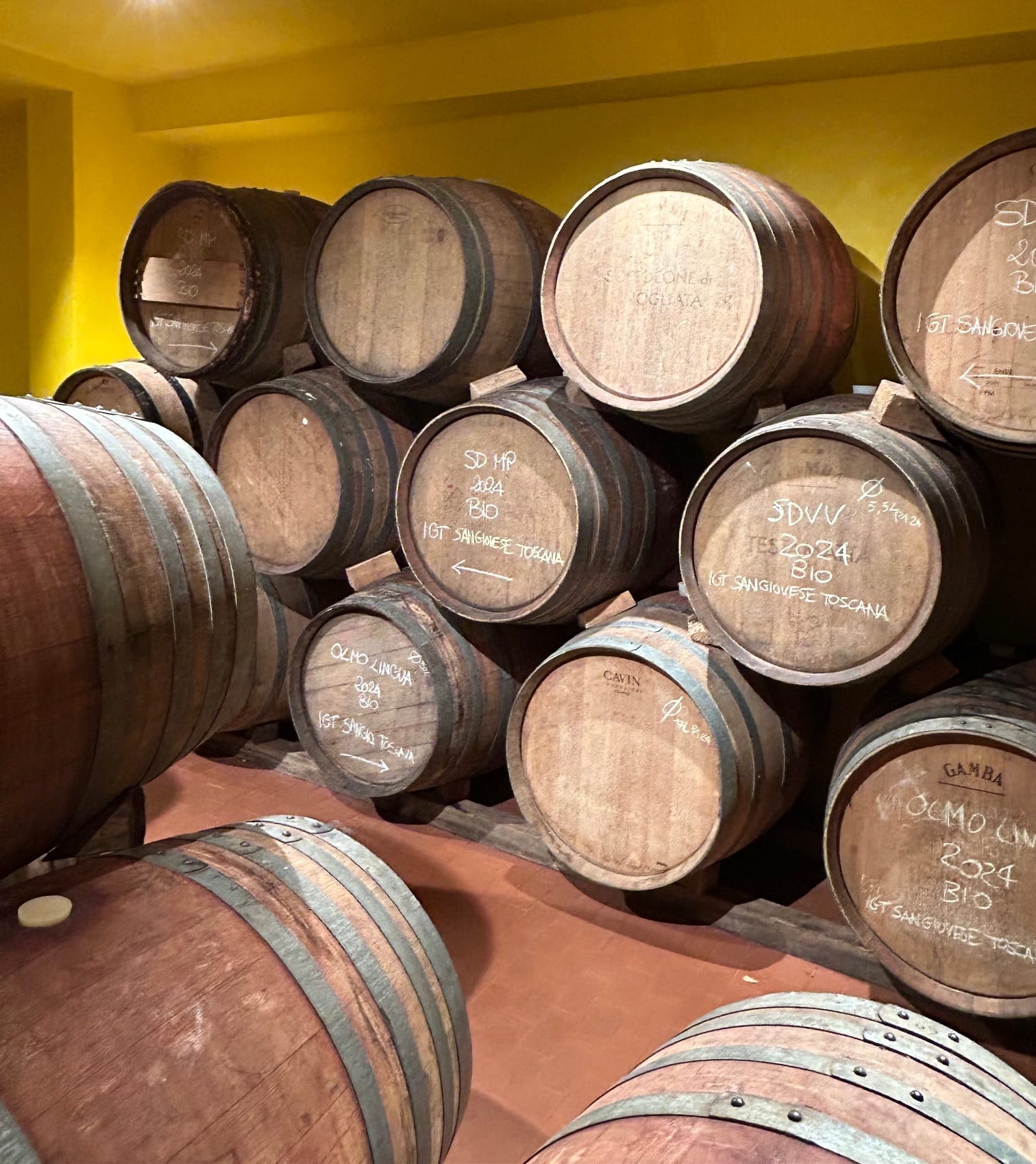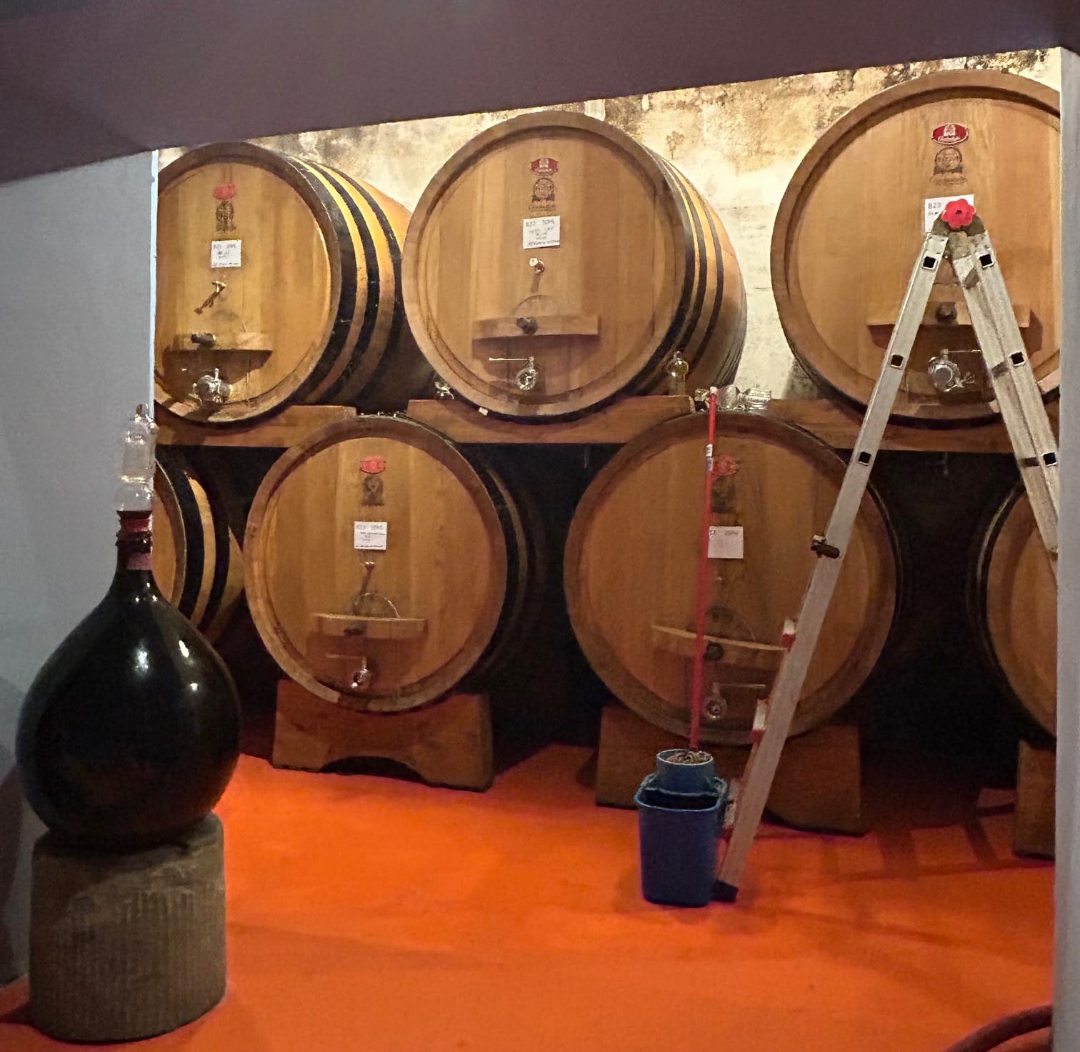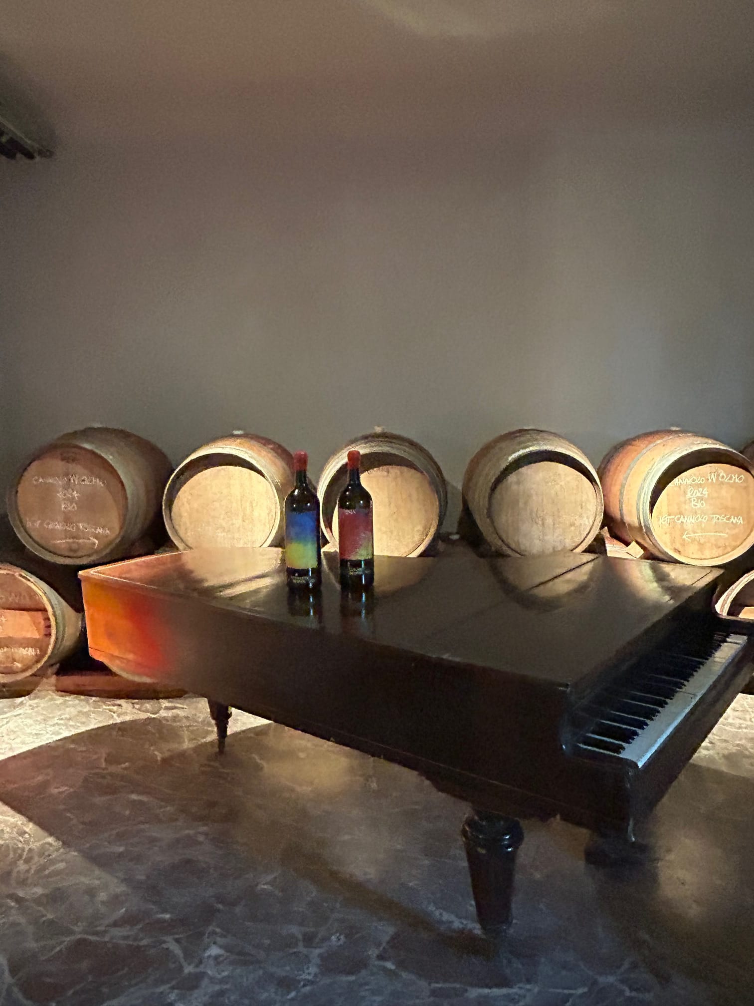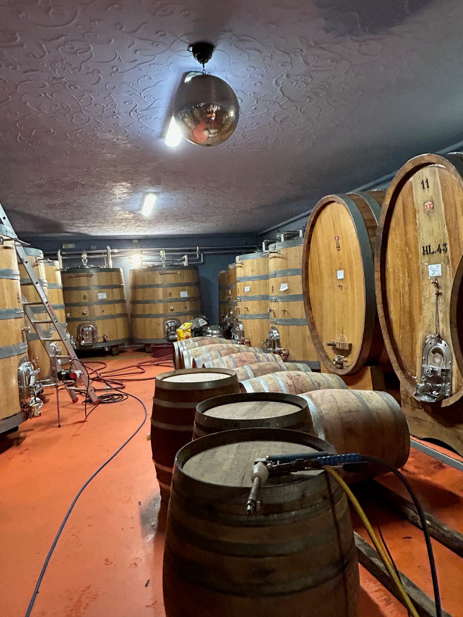 Fin novembre dernier, comme à l’accoutumée, j’ai pu me rendre au domaine afin de déguster les livrables 2023 de ces deux pépites, Testamatta et Colore, directement dans le chai au coeur de Fiesole. Son chai est un endroit complètement insolite, un palais historique de l’ancien hôtel, transformé en chai de vinification et d’élevage. Imaginez le cuvier de vinification dans une ancienne discothèque, comme les barriques et les foudres dans des endroits réservaient autrefois à l’accueil, à la restauration, les divers salons et j’en passe… Ici, le vin se bonifie tranquillement en présence de différentes oeuvres d’art, dans une atmosphère complètement hors du temps qui nourrit autant l’âme que les sens.