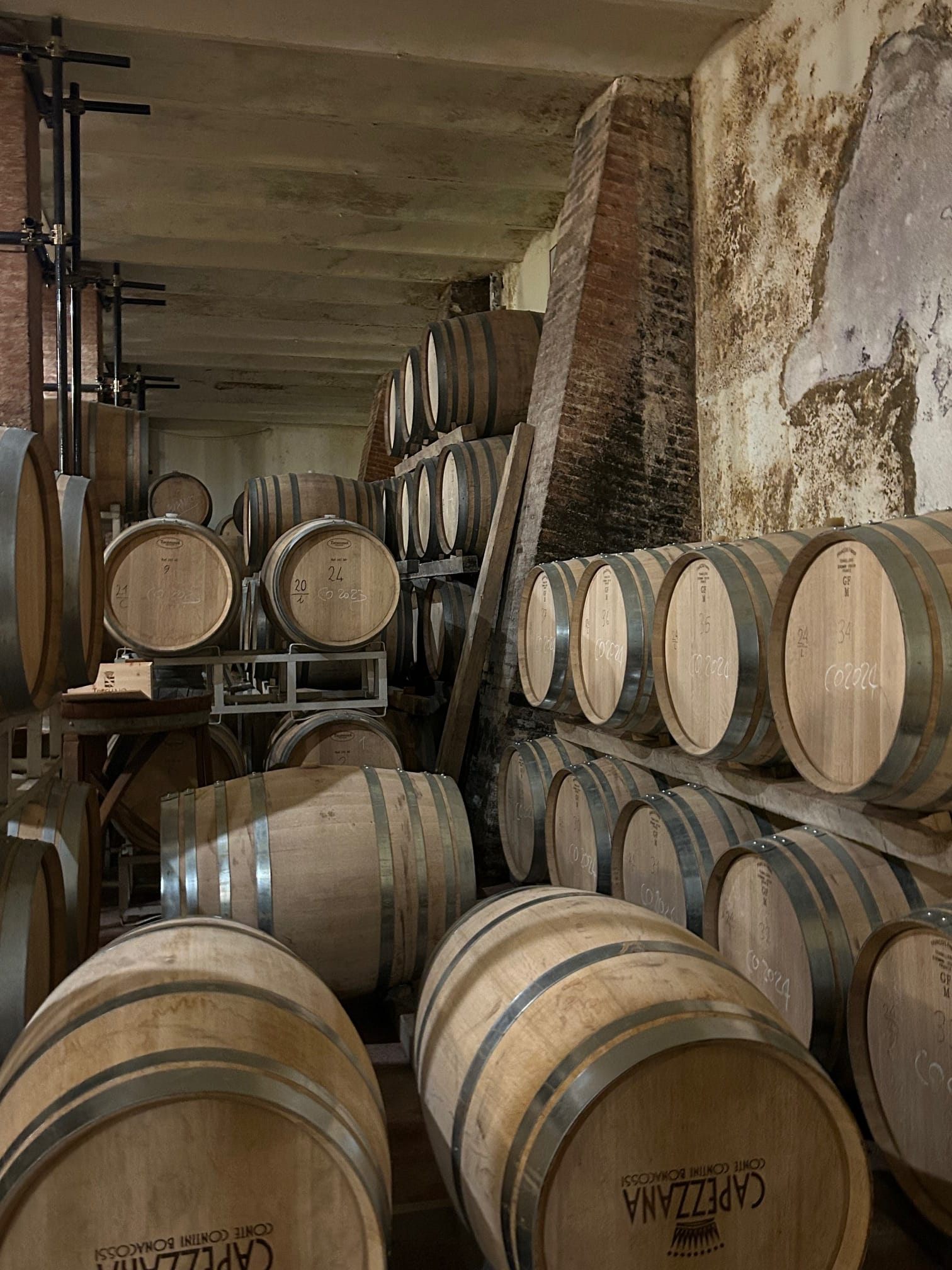 Si la Toscane s’identifie souvent au Sangiovese pur, Capezzana rappelle que Carmignano revendique depuis 18e siècles l’assemblage avec le Cabernet, bien avant le Chianti et la mode des « super-toscans ». Dans les cuvées emblématiques de la maison, le Sangiovese en cépage dominant apporte sa trame acide, son grain serré et ses notes de cerise noires fraiches, tandis que le Cabernet Sauvignon, parfois accompagné d’autres cépages, ajoute la structure, la profondeur et de tannins racés.