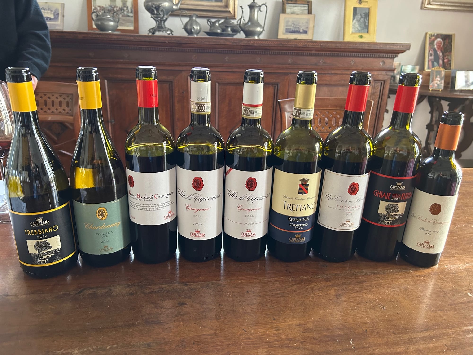 Capezzana produit une gamme de vins très éclectique, tout d’abord avec Villa di Capezzana, Carmignano DOCG, cuvée phare de la maison, qui existe depuis 1925. Il reste encore quelques flacons de ce premier millésime dans la cave du domaine. Elle est composée de 80% de Sangiovese et 20% Cabernet Sauvignon. J’ai dégusté 2021, le dernier millésime livrable, c’est une vraie signature de l’appellation, avec un rouge structuré et précis, qui garde la fraicheur de fruits, jolie acidité qui nous procure une très bonne buvabilité. J’ai dégusté la même cuvée Villa di Capezzana 2015, vieilli 10 ans dans la cave du domaine. On y retrouve la même trame de fraicheur et de fruits avec de tanins soyeux et toujours très bien structuré, aujourd’hui elle est à son apogée.