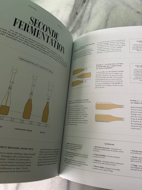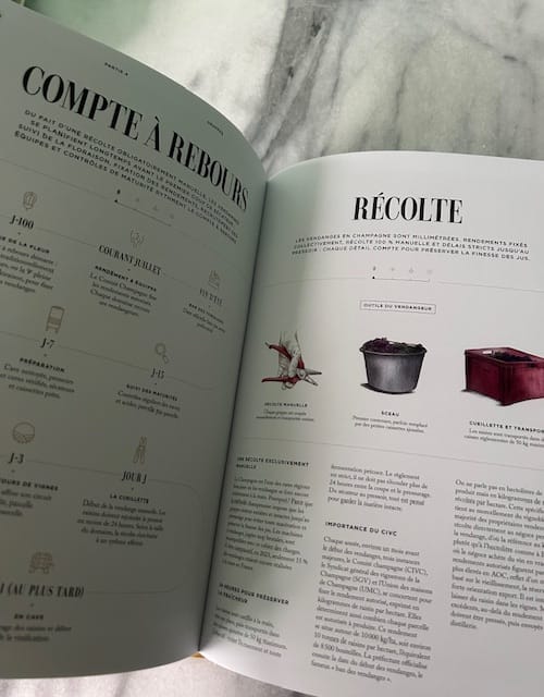 L’élaboration du champagne est détaillée étape par étape, depuis la vendange jusqu’à la mise en bouteille. Le livre met en lumière la rigueur nécessaire dans chaque phase : pressurage délicat, fermentation contrôlée, assemblage précis des crus, seconde fermentation en bouteille (prise de mousse), dégorgement et dosage. Chaque étape est illustrée de manière claire, permettant au lecteur de comprendre la technicité et la patience indispensables pour obtenir la finesse et l’élégance caractéristiques du champagne.