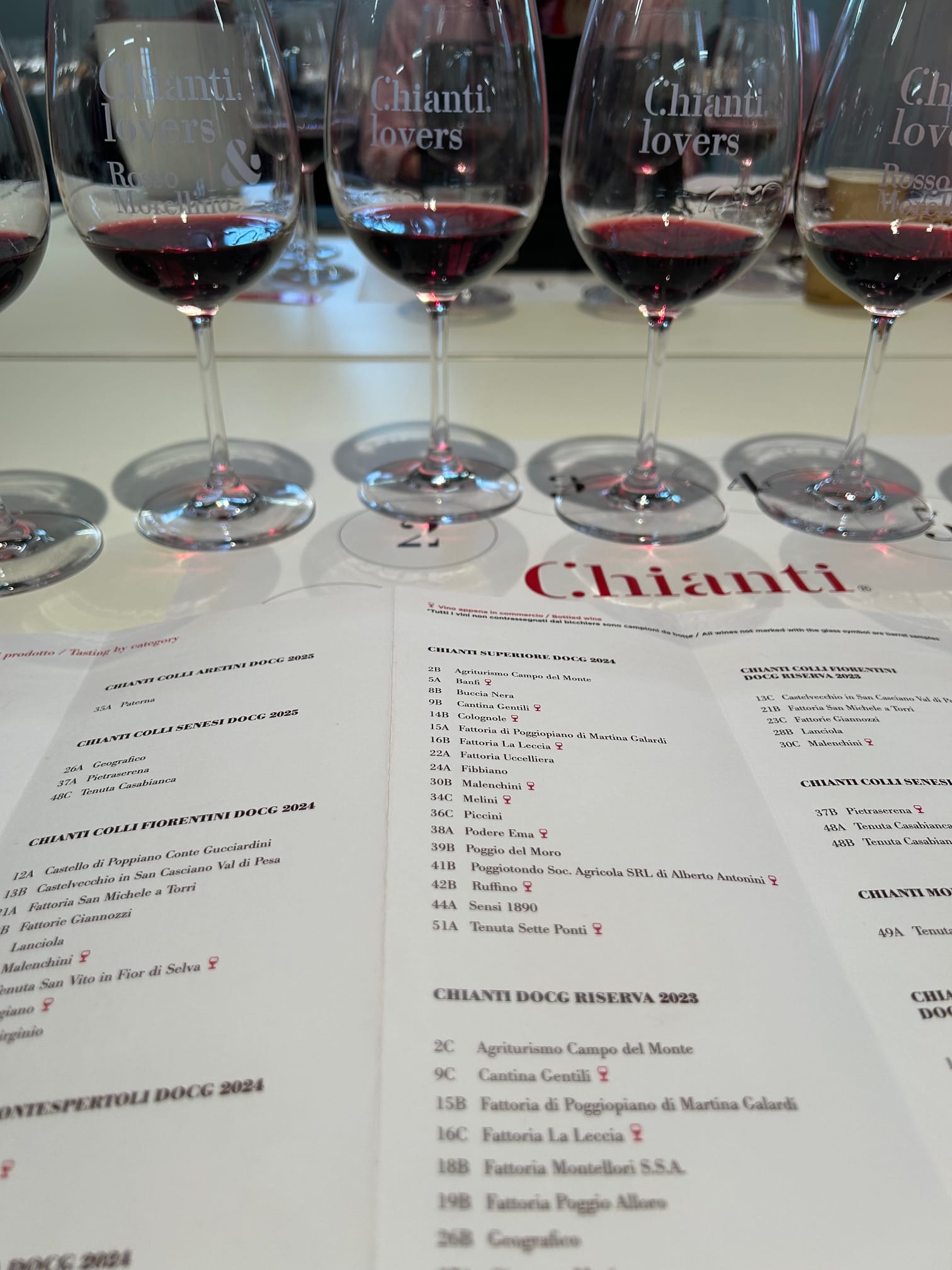 Au totale 56 producteurs de Chanti avec 106 cuvées dont 57 Annata 2025, 18 Superiore 2024 et 31 Riserva 2023, sans oublier dans ce panel Chianti Rùfina, Colli Senesi, Colli Aretini, Colli Fiorentini, Montespertoli, et Montalbano.