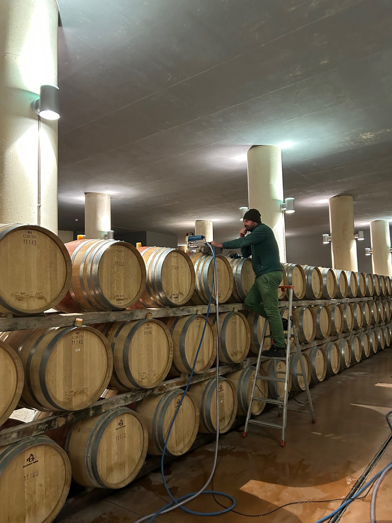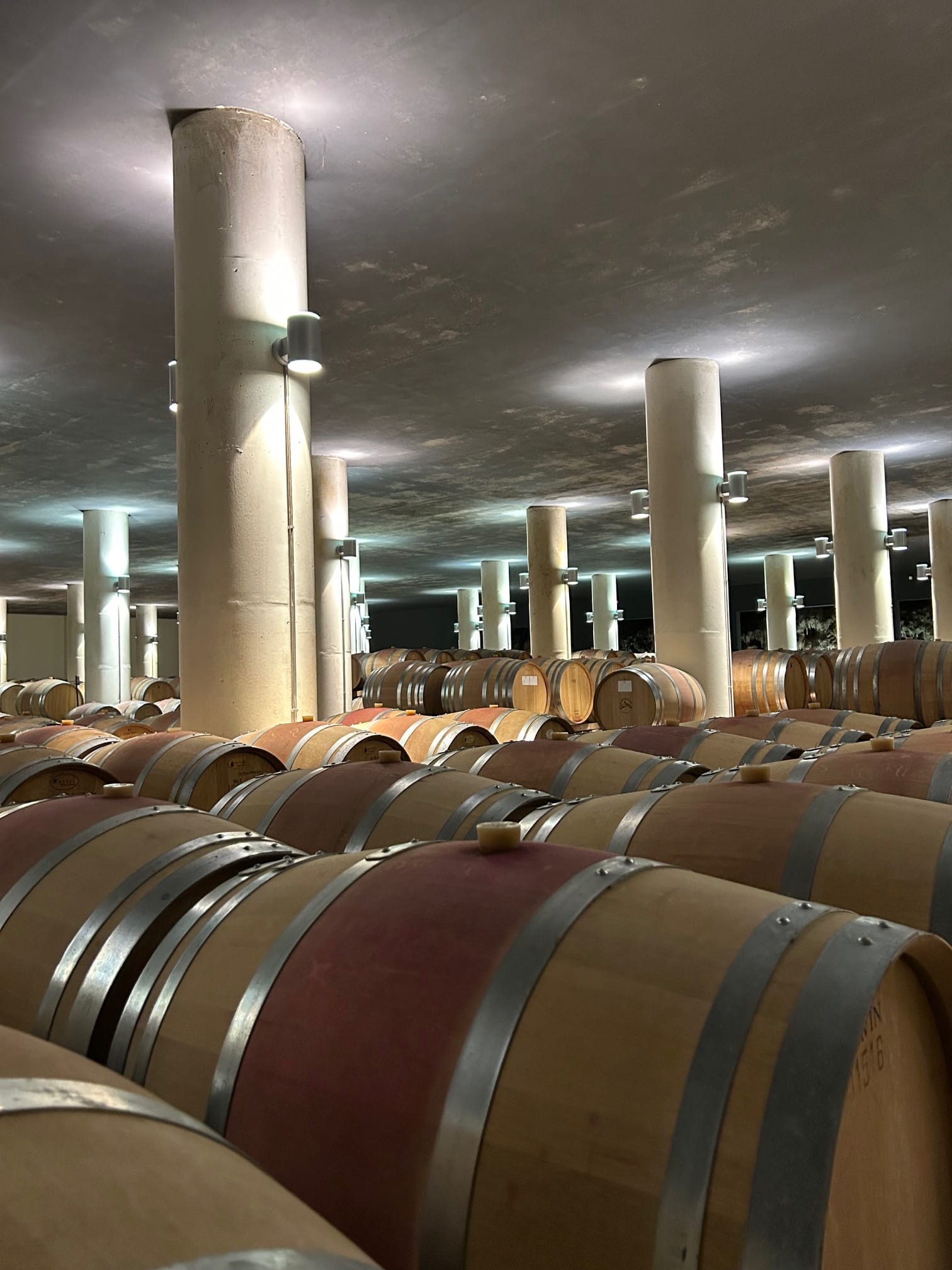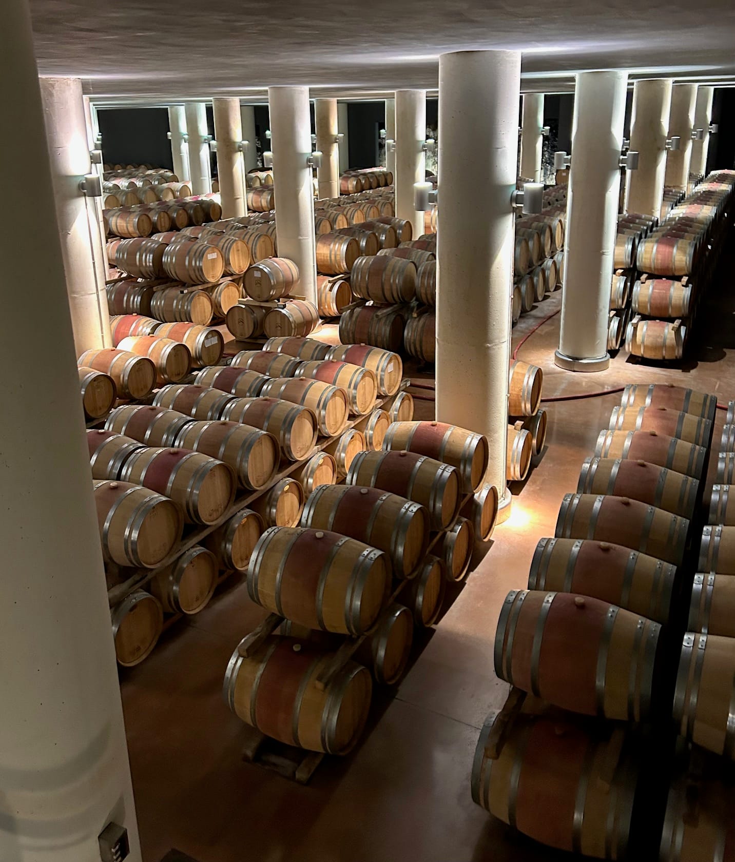 Au cœur de cette immense construction, à quinze mètres sous terre, creusée dans la roche, le spectaculaire chai à 3000 barriques, toutes en chêne, qui bénéficient de la fraicheur et de l’humidité naturelle apporté par la roche nue traversée par de nombreuses veines d’eau, créant ainsi, les conditions idéales pour l’élevage et conservation des vins.